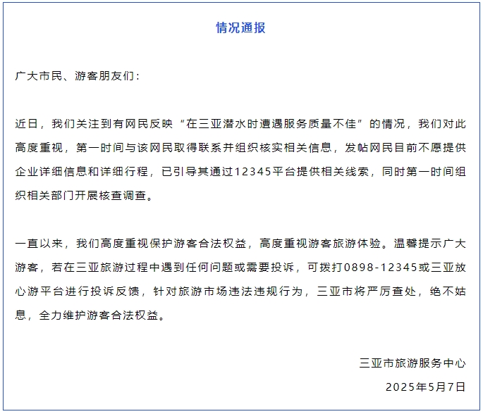 央视网消息:三亚市旅游服务中心5月7日通报,近日,有网民反映“在三亚潜水时遭遇服务质量不佳”的情况,三亚市旅游服务中心第一时间与该网民取得联系并组织核实相关信息,发帖网民目前不愿提供企业详细信息和详细行程,已引导其通过12345平台提供相关线索,同时第一时间组织相关部门开展核查调查。