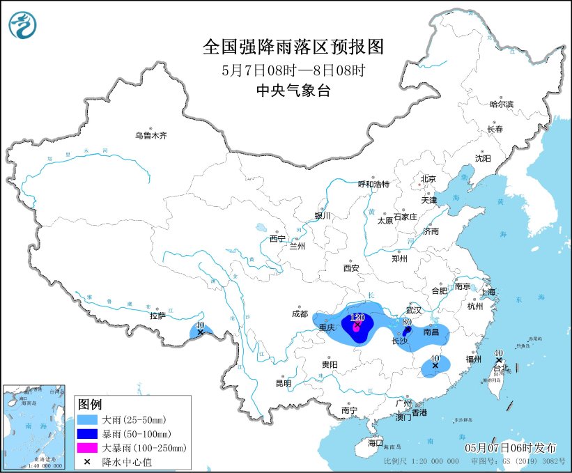 预计,5月7日08时至8日08时,西藏东南部、西南地区东部、江南西北部和中部等地部分地区有大到暴雨,其中,湖北西南部、湖南西北部、重庆东南部等地部分地区有大暴雨(100~120毫米)。上述部分地区伴有短时强降水(最大小时降雨量20~50毫米,局地可超过60毫米),局地有雷暴大风等强对流天气。
