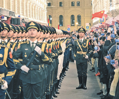 当地时间5月3日,中国人民解放军仪仗司礼大队在莫斯科参加纪念苏联伟大卫国战争胜利80周年庆典阅兵式第二次彩排。于子恒摄
