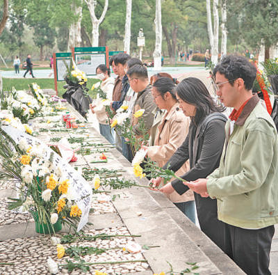 4月4日清明节,湖北武汉江汉大学的师生自发前往武汉市解放公园,缅怀为阻击日寇而英勇牺牲的苏联援华航空队烈士。 何天琪摄