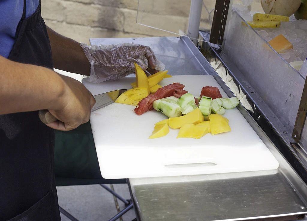 路边摊位上摆放好的果切,我们并不清楚制作和存放时间。水果变质的程度会随着存放时间的延长而增加,食用安全风险也会随之增加。