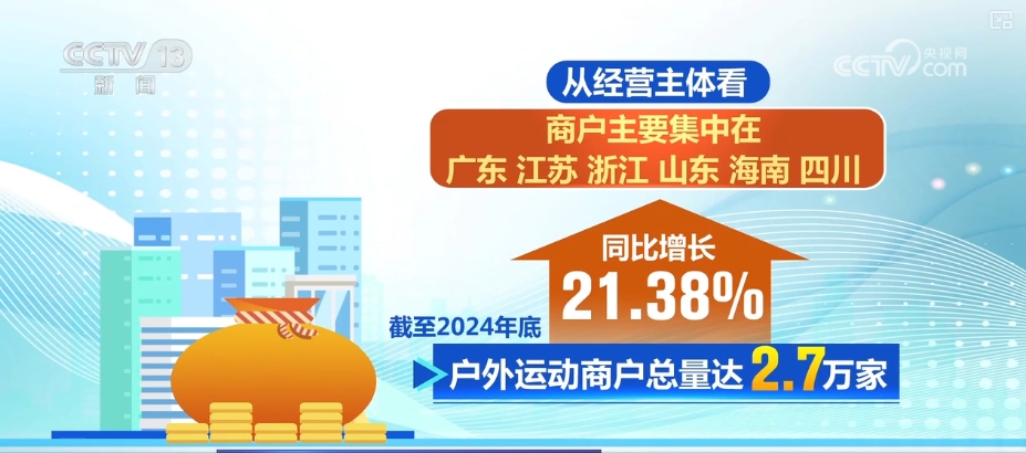 就消费人群年龄段来看,25—34岁占比最高,达到43%;其次为35—44岁,占比为28%。从行政区划看,广东、浙江消费人群占比较高,分别为11.72%和9.36%。从经营主体看,截至2024年底,户外运动商户总量达2.7万家,同比增长了21.38%。商户主要集中在广东、江苏、浙江、山东、海南和四川。