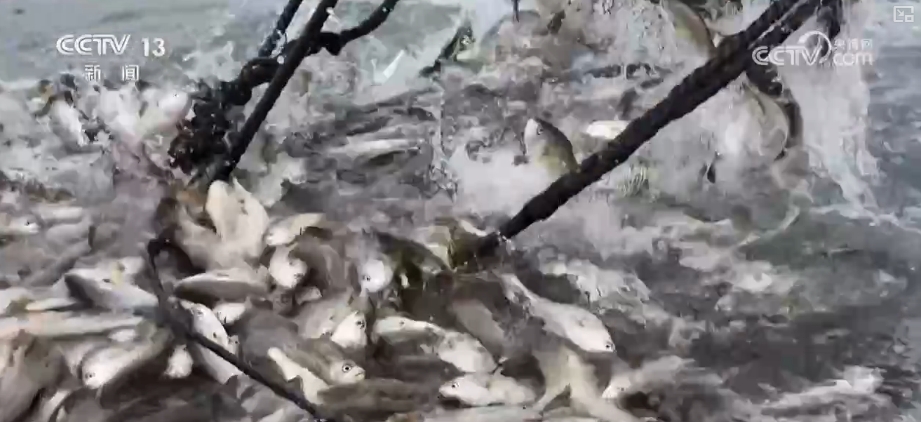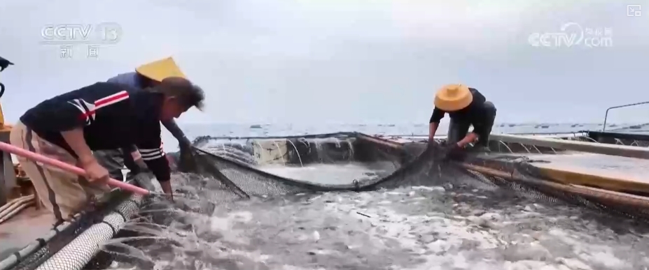 渔排上,村民正忙着给大黄鱼“搬家”。大家用铁钩将渔网拉起,通过制造声响将鱼群赶至网中,随后用活水船上的机械臂将大黄鱼吊起倒入船舱,再运到外海的深水大网箱中。