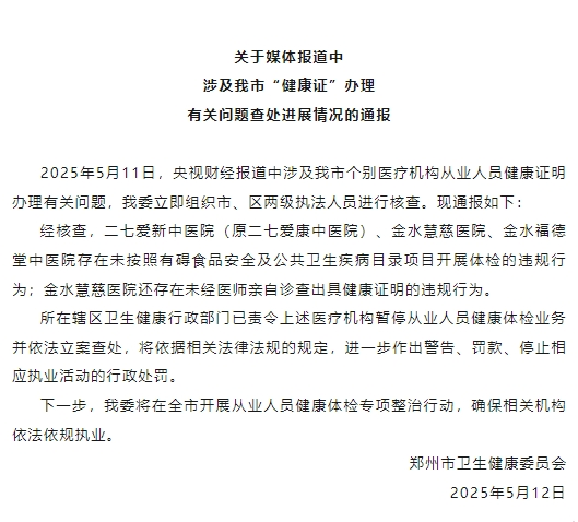 ·郑州通报涉“健康证”办理有关问题查处进展情况。