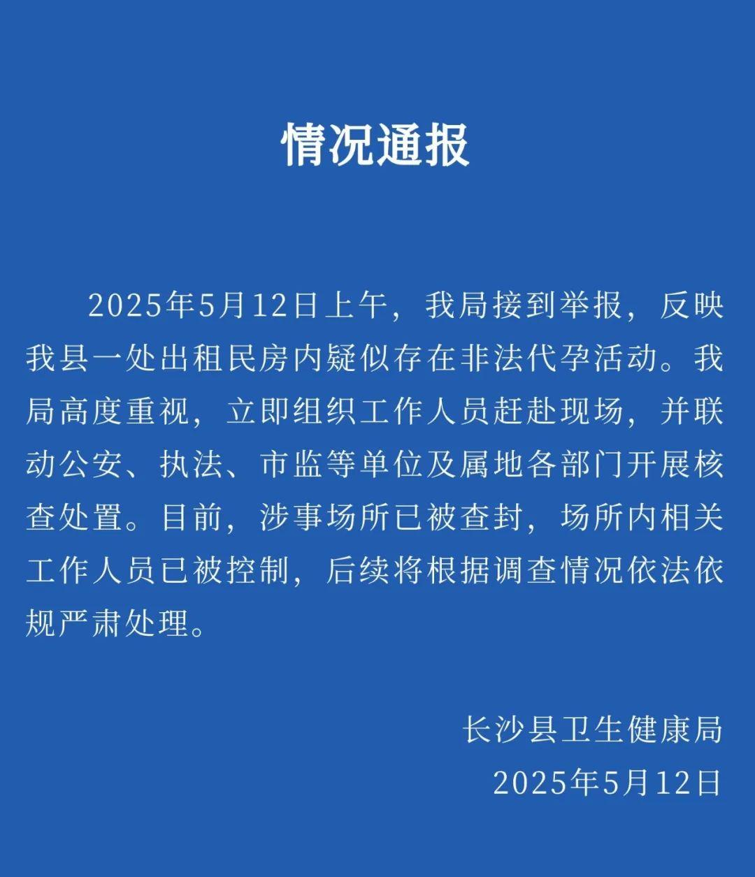 ·长沙县卫生健康局通报出租房疑存非法代孕活动。