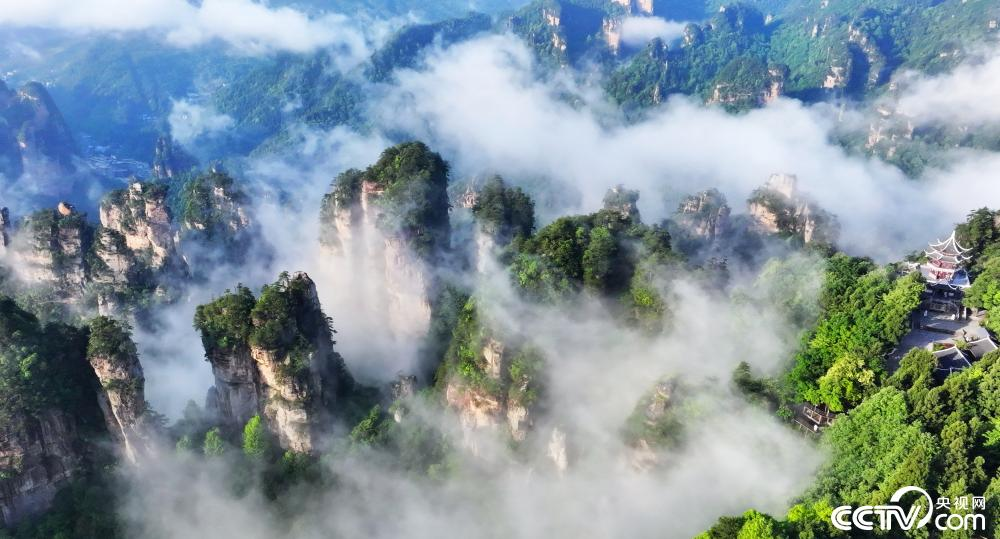 湖南张家界国家森林公园黄石寨景区一带云海翻滚,山峰仿佛漂浮在空中。