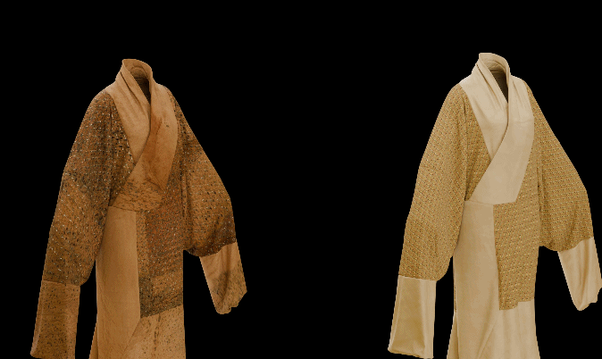“赭黄色纱地印花敷彩丝绵袍”数字孪生模型还原“新衣”和“旧衣”。