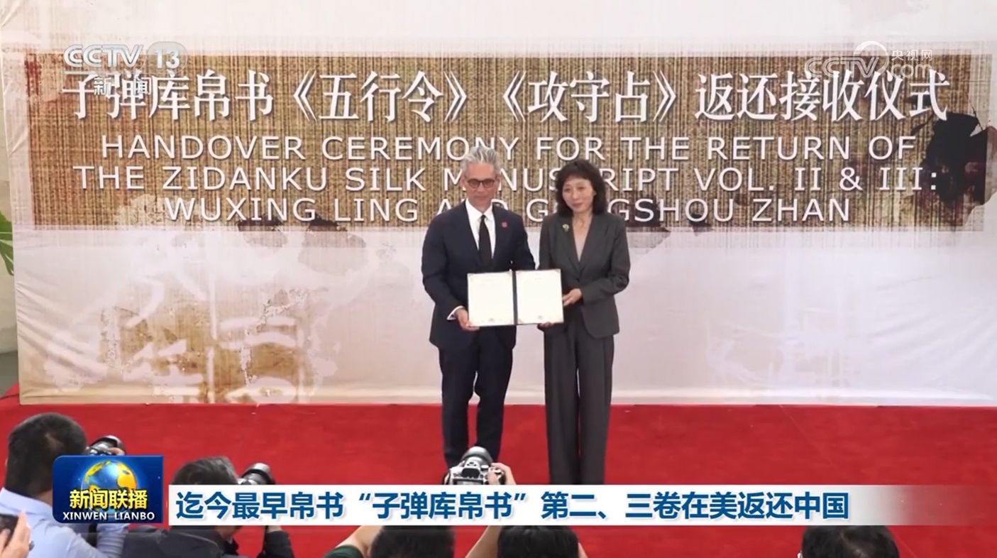 美国当地时间5月16日,国家文物局在中国驻美国大使馆,接收美方返还的子弹库帛书第二卷《五行令》和第三卷《攻守占》,帛书全卷于1946年非法流失到美国。