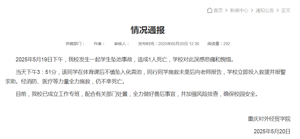重庆对外经贸学院5月20日发布《情况通报》称:2025年5月19日下午,该校发生一起学生坠池事故,造成1人死亡。