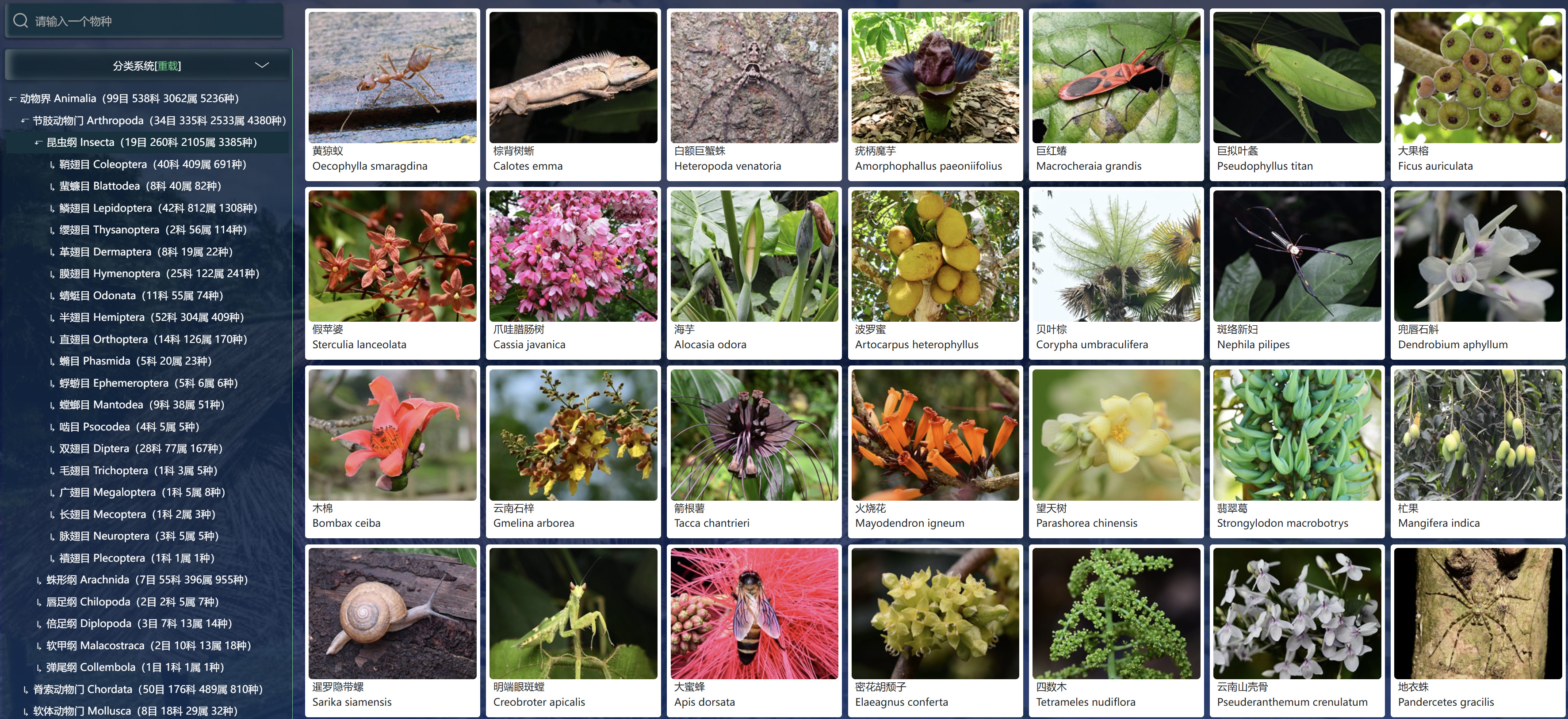 作为中国首个以热带生物多样性为主题的数字平台,其向公众展示物种记录9万余条,包含物种15622种(原生种约占70%),其中动物5236种、植物9779种、真菌等其他生物607种,国家一级保护物种59种、国家二级保护物种343种。所有数据来源于加新笔记公民科学平台,这些数据包括新种新记录文献、标本记录和自然观察记录,每条数据可溯源、可修订,动态展示最真实的西双版纳生物多样性。