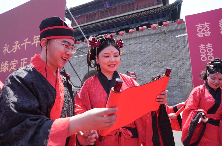 2025年5月17日,在河北省石家庄市正定古城举行的集体婚礼上,一对新人在阅读婚书。新华社发(梁子栋摄)