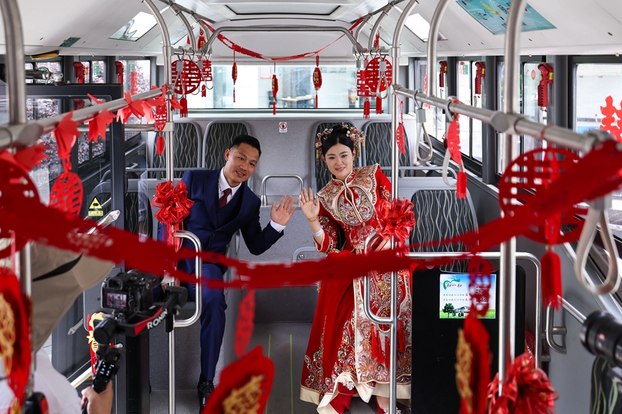 2025年4月30日,“爱情巴士”搭载着新郎新娘前往浙江诸暨市同山镇唐仁村祠堂进行婚礼仪式。新华社记者 江汉 摄