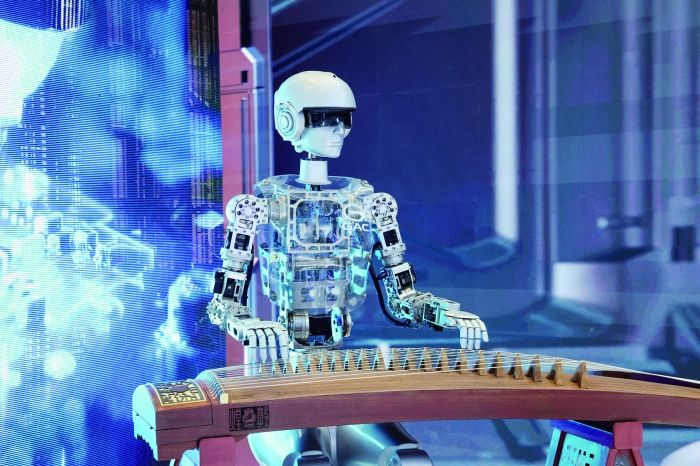 5月23日,在文博会现场,机器人表演弹古筝。 新华社图