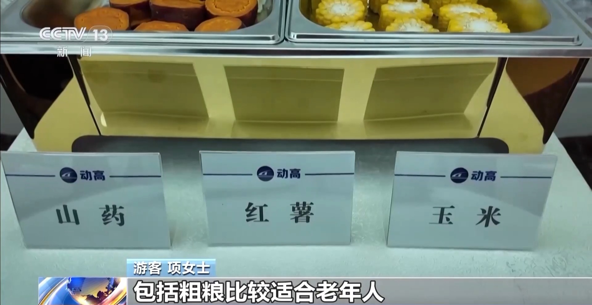 游客 项女士:品种比较多。吃饭荤素搭配,包括粗粮,都比较适合老年人。