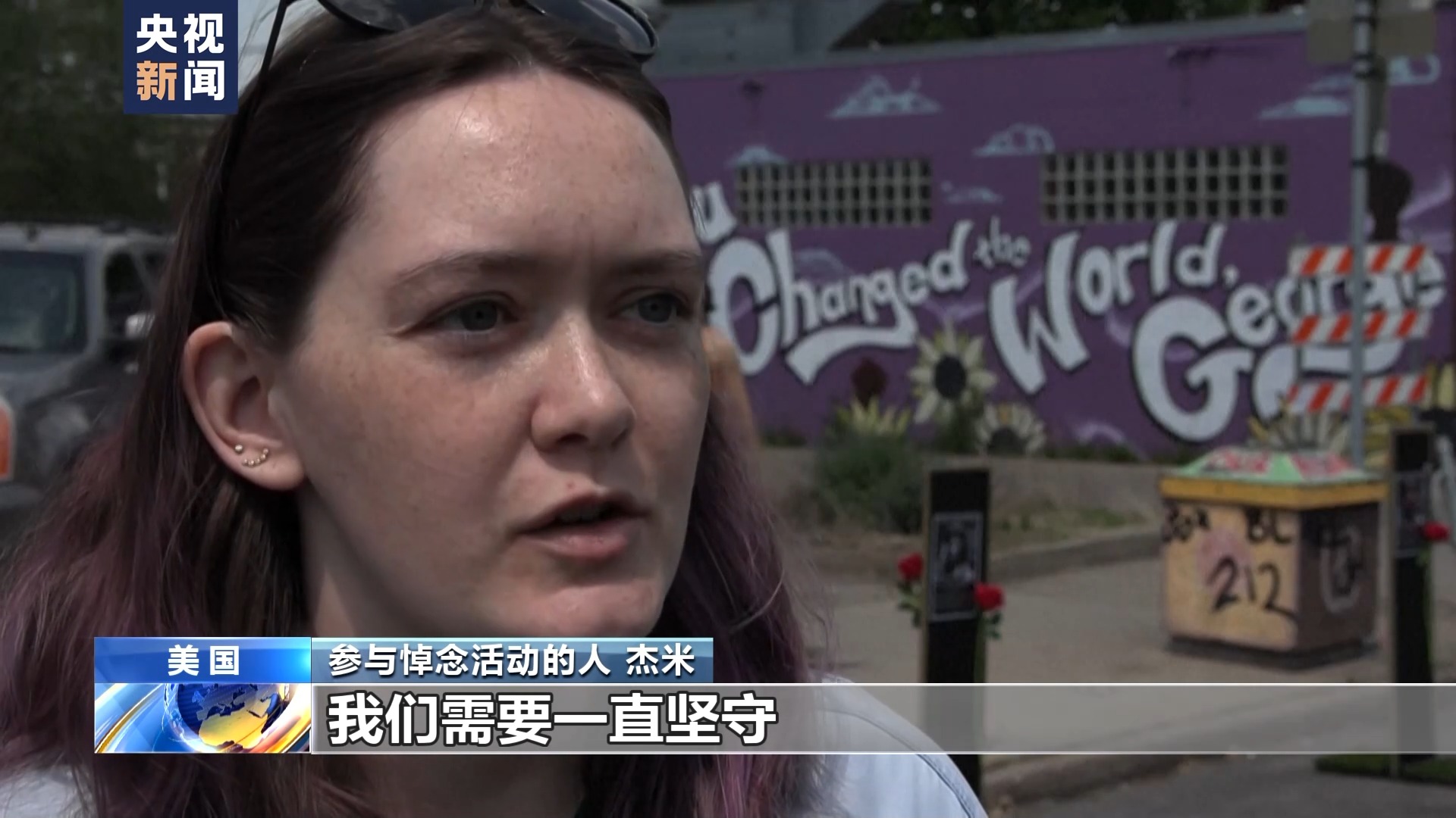 参与悼念活动的人 杰米:乔治·弗洛伊德遇害时,我住在这附近。我认为每年举行纪念,坚持到场很重要。这不是转瞬即逝的时刻,我们需要一直坚守。