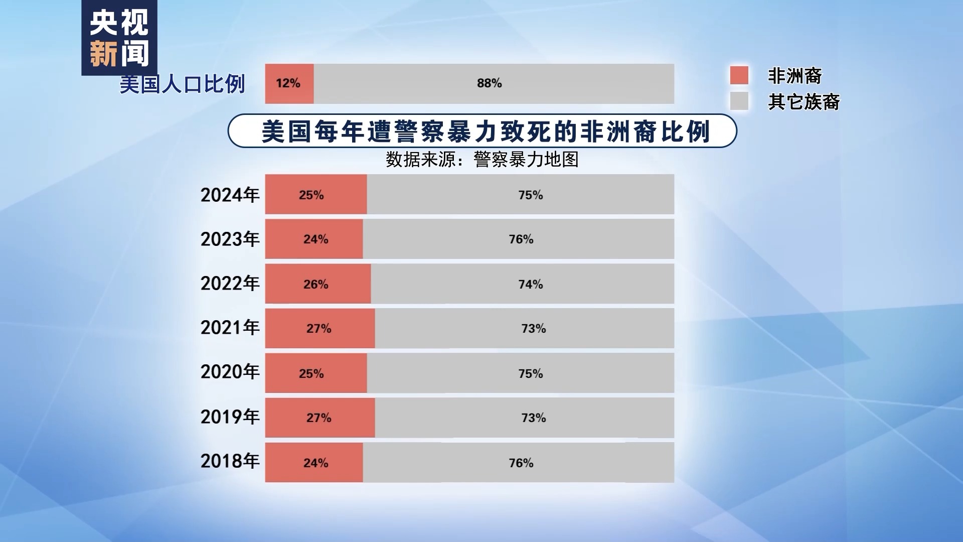 非洲裔仍然是最容易遭到警察暴力的群体,非洲裔占到美国总人口的12%。2020年,在遭警察暴力致死的美国人中,非洲裔占25%,而在2024年,这一比例仍高达25%,并没有减少。最近5年,这一比例也在25%上下徘徊。