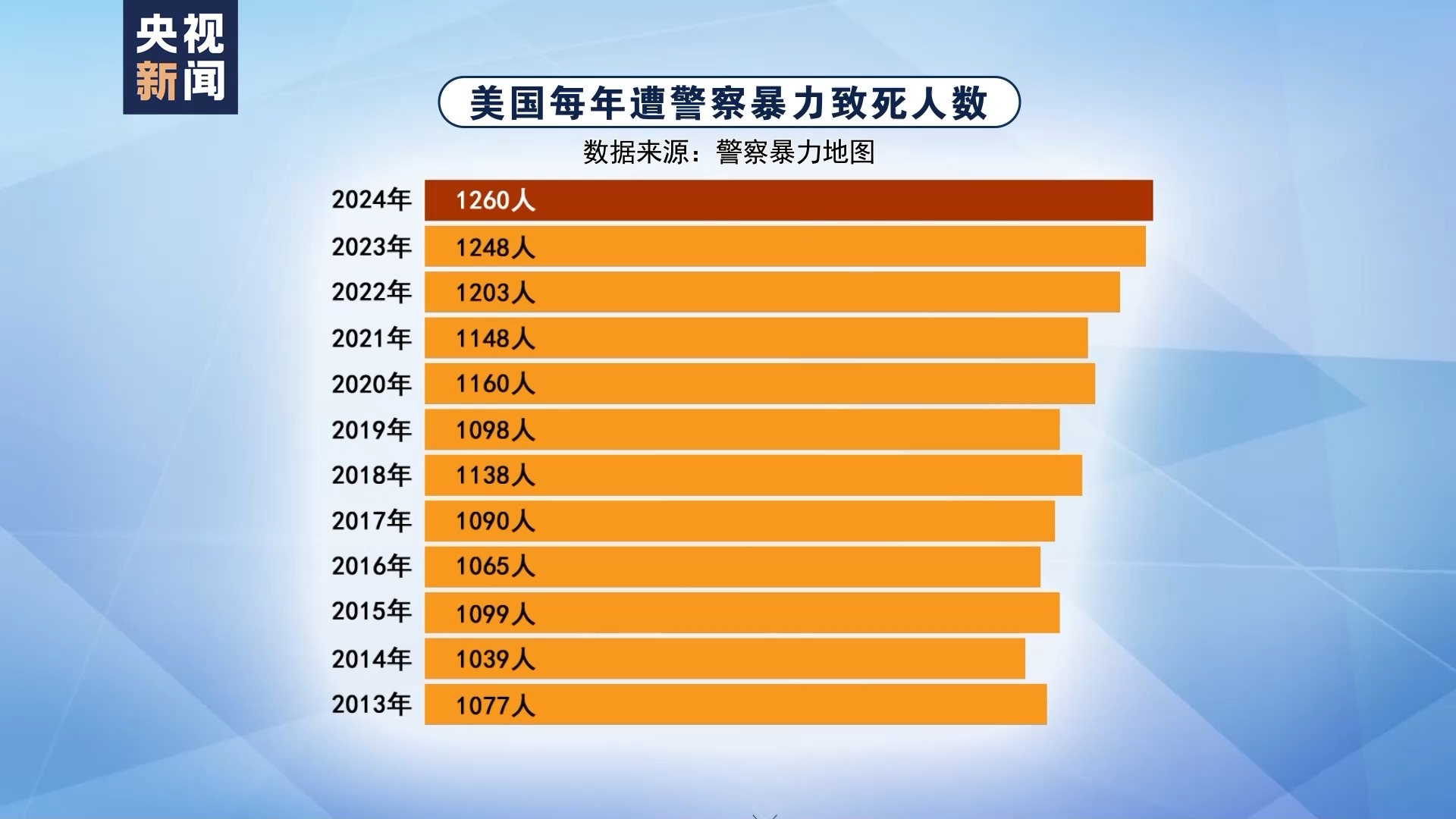 根据美国警察暴力地图网站的统计,自弗洛伊德被跪杀后,虽然美国社会各界不断呼吁警察改革,但警察暴力并没有减少。2020年,美国遭警察暴力致死的人数为1160人,而到了2024年,这一人数升至1260人。