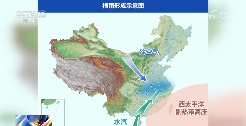 梅雨的形成与副热带高压的位置和冷空气强弱有关,春末夏初,副热带高压向北移动过程中,其西北侧的暖湿气流和北方南下冷空气对峙产生降雨,当二者势均力敌时,雨带就会相对稳定在长江淮河一带,形成梅雨。