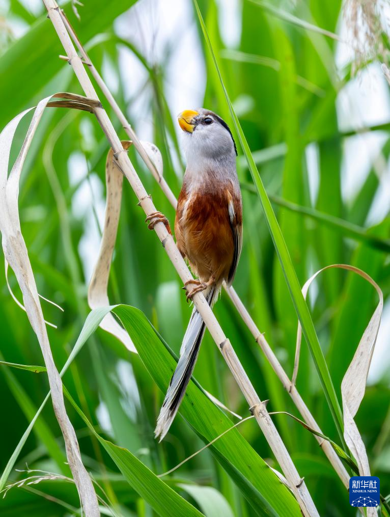在九龙口国家湿地公园里,国家二级保护野生动物、“鸟中大熊猫”震旦雅雀在芦苇丛中觅食(6月7日摄)。新华社记者 魏培全 摄