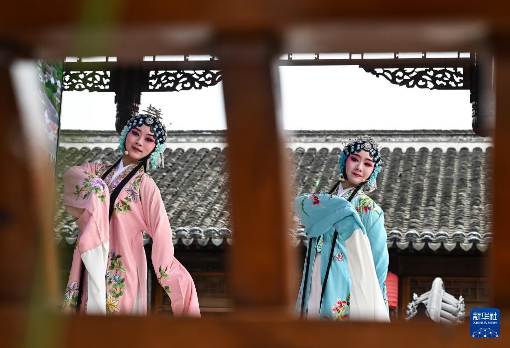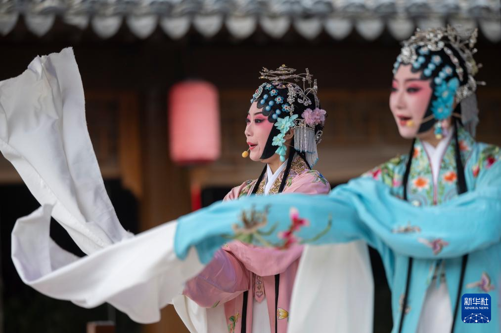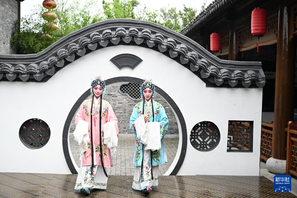 6月7日,建湖县淮剧团演员夏诗雅(左)、夏荣在淮剧小镇演出。新华社记者 季春鹏 摄