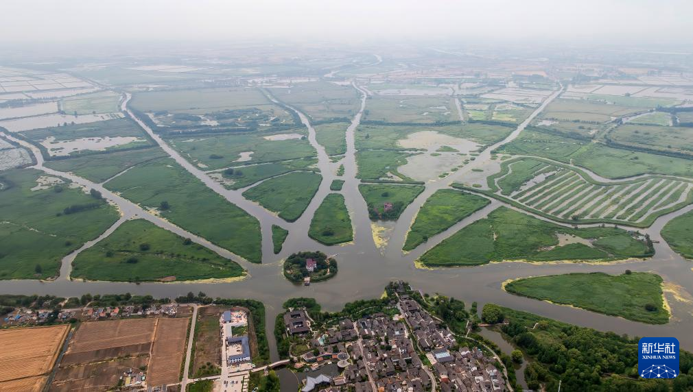 6月7日拍摄的江苏省盐城市建湖县淮剧小镇和九龙口国家湿地公园(无人机照片)。