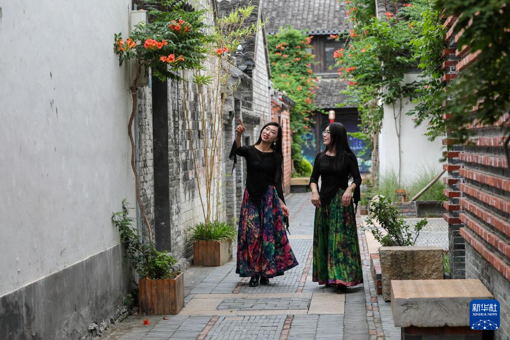 两名游客走过江苏省盐城市建湖县淮剧小镇沙庄戏苑(6月7日摄)。新华社记者 魏培全 摄