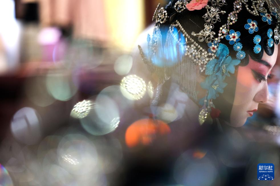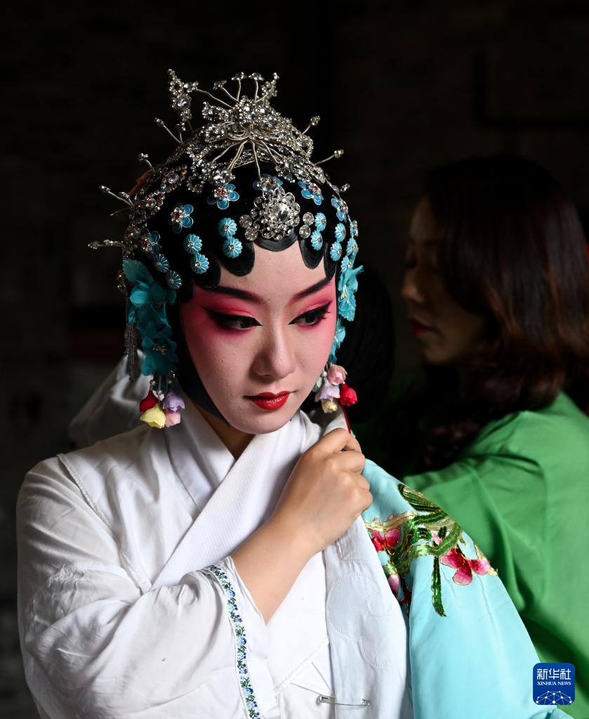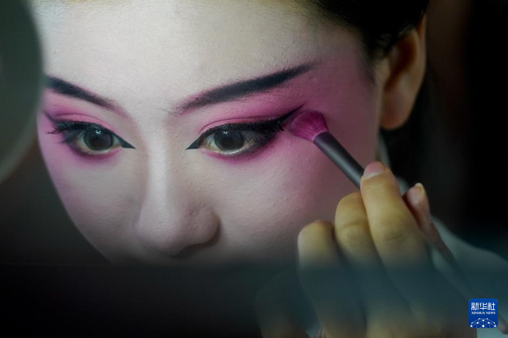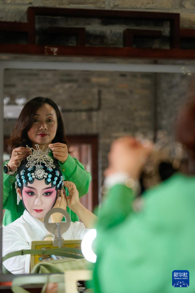 在建湖淮剧小镇,建湖县淮剧团青年演员夏荣在化妆(6月7日摄)。新华社记者 胥冰洁 摄
