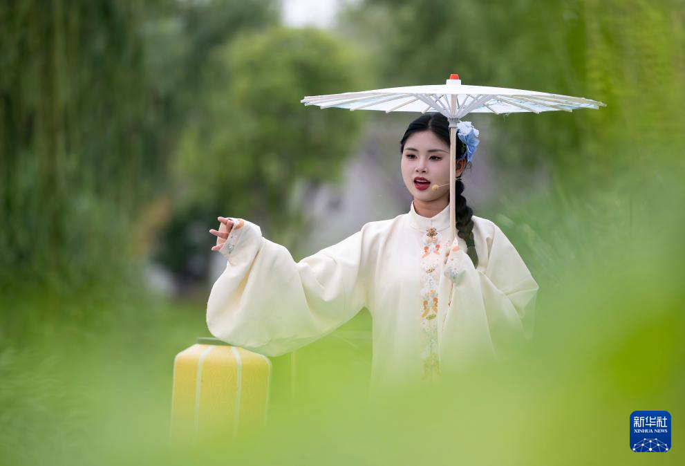 6月7日,演员龚欣冉在淮剧小镇一处小舞台唱淮歌版《青花瓷》。淮剧小镇每天都有百余名演员分布在大戏院和小舞台,为观众献上精彩演出。新华社记者 郎兵兵 摄