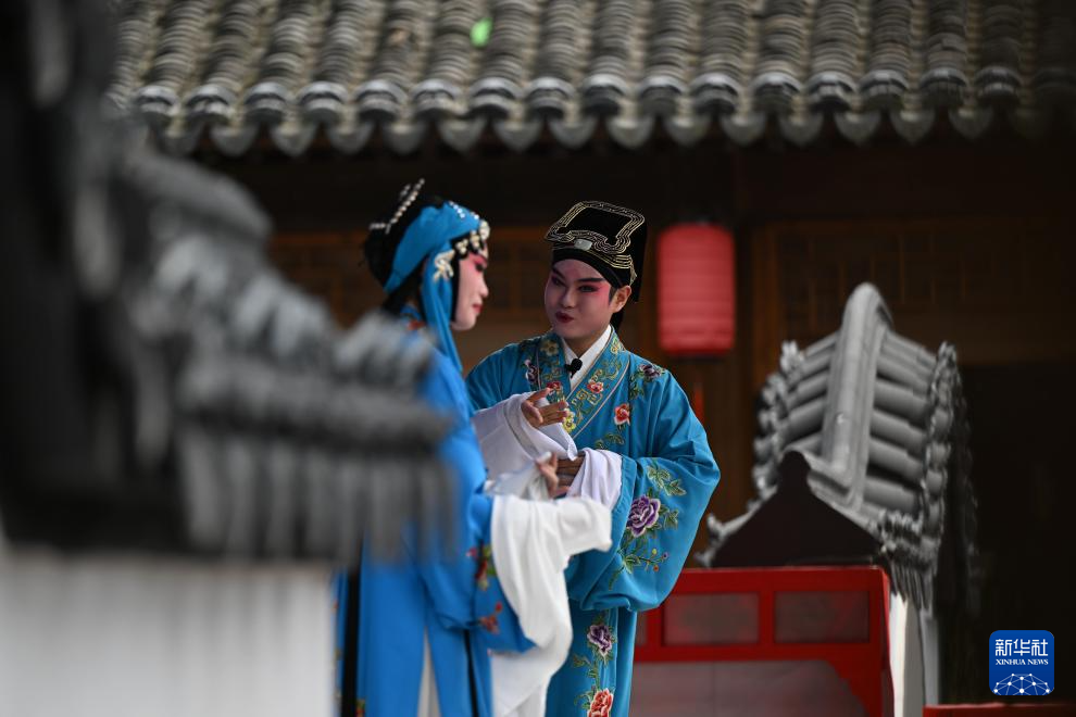 6月7日,演员祁欢和王威(右)在淮剧小镇表演淮剧。新华社记者 侯昭康 摄