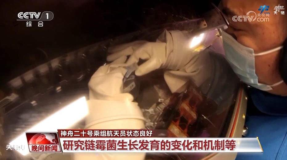 在生物技术实验柜内,“空间微重力对微生物的效应机制研究”持续推进,在空间微重力环境下,航天员进行了链霉菌的生长、发育分化、生物活性物质合成、种群传代演替的变化和机制等研究。利用科学手套箱,航天员完成了液体培养样品采集工作,并将其冷冻保存等待下行。在空间微重力物理领域,乘组完成了燃烧柜实验插件采样盖更换、无容器柜清洁维护等工作。