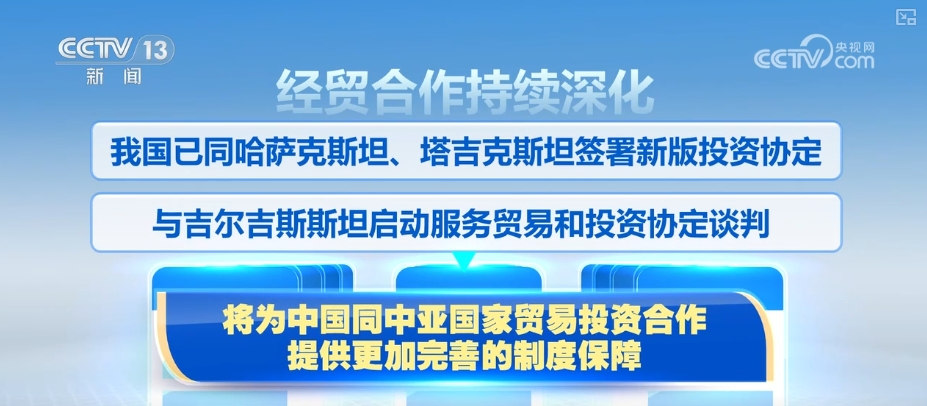 经贸合作持续深化。我国已同哈萨克斯坦、塔吉克斯坦签署新版投资协定,与吉尔吉斯斯坦启动服务贸易和投资协定谈判,将为中国同中亚国家贸易投资合作提供更加完善的制度保障。