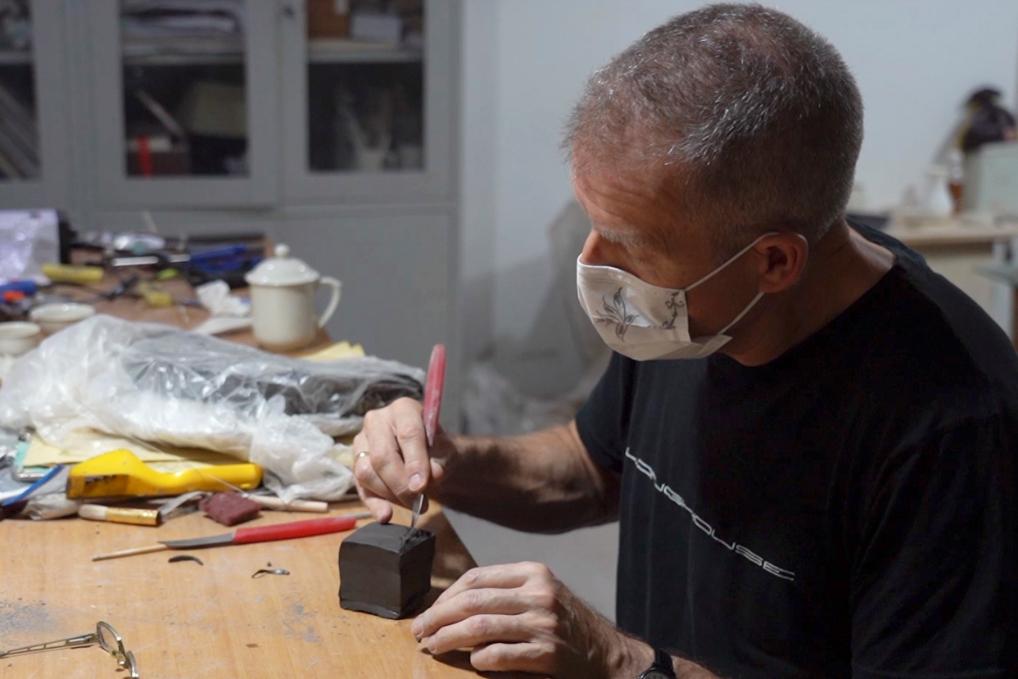在河北省曲阳县的工作室,美国陶艺家马克·路弗德在定瓷泥料上刻花。新华社记者 邹尚伯 摄