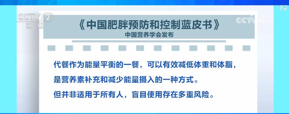 中国营养学会发布的《中国肥胖预防和控制蓝皮书》中提出,代餐作为能量平衡的一餐,可以有效减低体重和体脂,是营养素补充和减少能量摄入的一种方式。但并非适用于所有人,盲目使用存在多重风险。