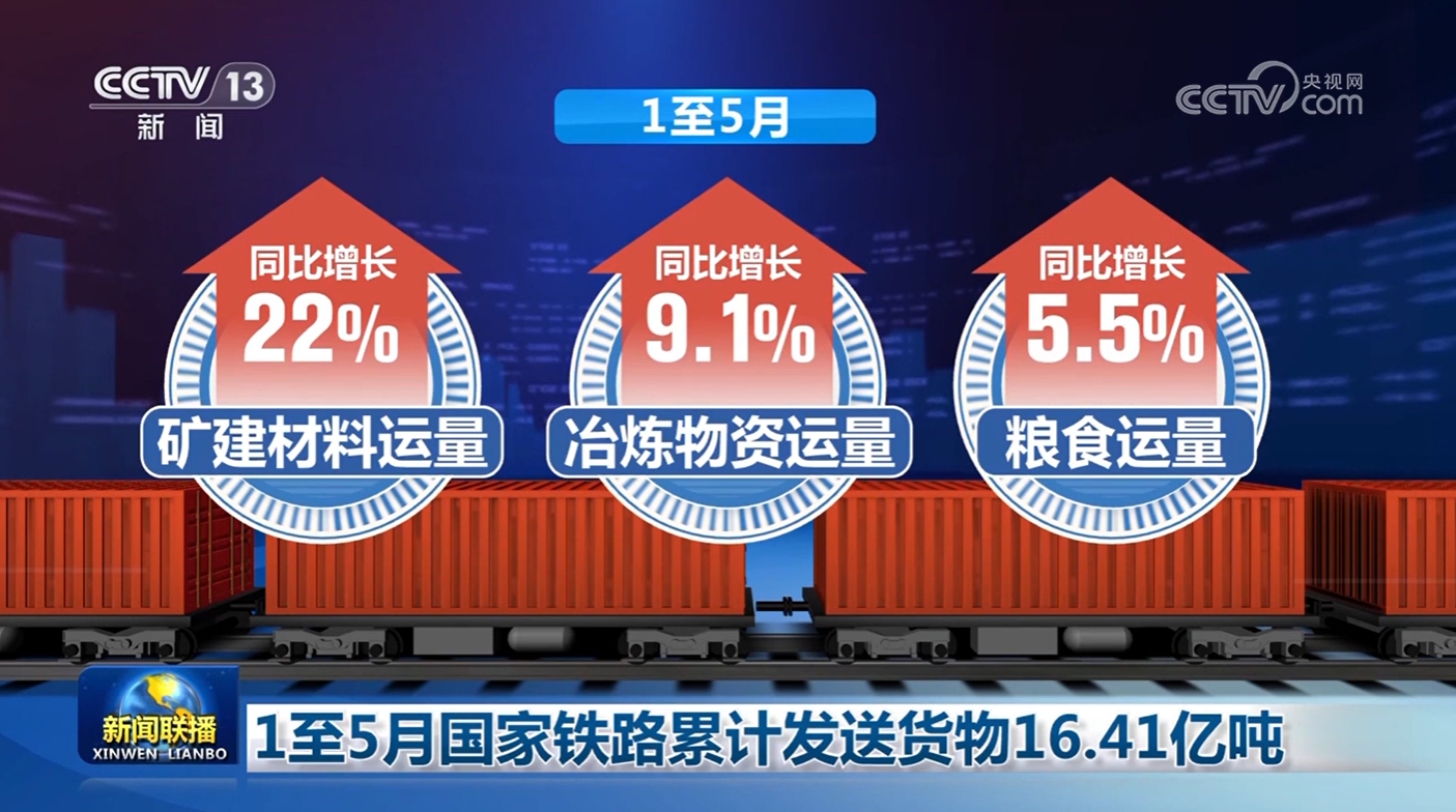 大宗物资运输保障有力。1至5月,国家铁路发送煤炭8.45亿吨。矿建材料、冶炼物资、粮食运量同比分别增长22%、9.1%、5.5%,为国民经济平稳运行提供有力支撑。