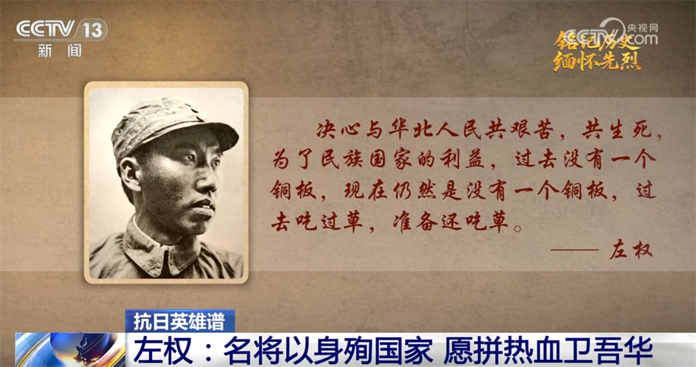 央视网消息:“名将以身殉国家,愿拼热血卫吾华。太行浩气传千古,留得清漳吐血花。”这是朱德元帅在左权将军牺牲后撰写的缅怀诗。左权将军是八路军在抗战中牺牲的最高级别将领,他用铮铮铁骨为中华民族的独立与解放建立了不朽的历史功勋。6月23日的《抗日英雄谱》,我们一起缅怀杰出的无产阶级革命家、军事家左权。