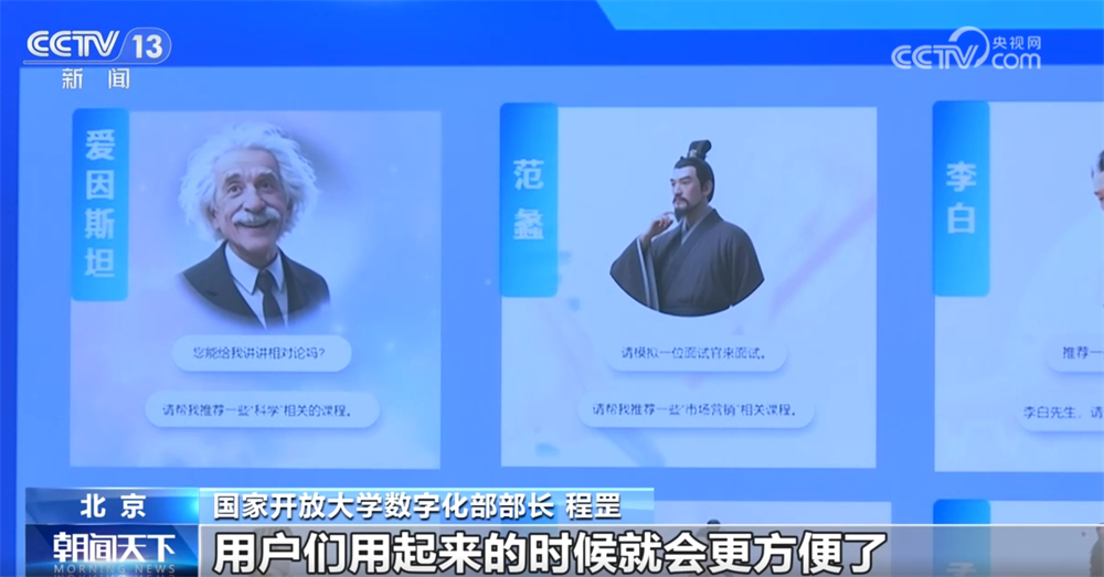国家开放大学数字化部部长程罡称:“平台上新了很多智能化的功能,包括智能搜索、智慧学伴的升级,推出了8个专属的智能体,比如说爱因斯坦聊科学智能体就特别擅长回答科学类的问题,用户们用起来的时候就会更方便了。”