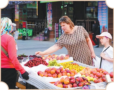 俄罗斯游客在满洲里街头购物。