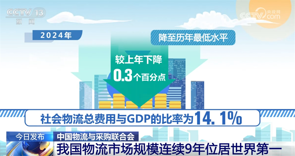 经济运行过程中的社会物流成本稳步下降。2024年社会物流总费用与GDP的比率为14. 1%,较上年下降0. 3个百分点,降至历年最低水平。以当前GDP规模测算,相当于节约物流成本超过4000亿元。