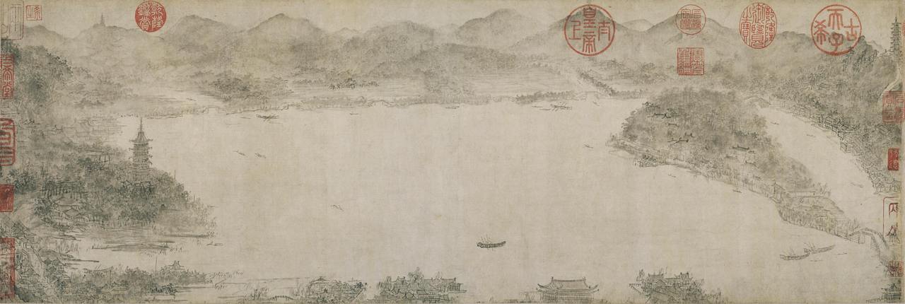李嵩的《西湖图》是在目前古代书画传世作品中,是最早把西湖全景融入一幅画面当中的代表作。艺术家对自然山川有极其高超的概况能力,他带你飞起来俯瞰。画中的群山,没有惯见的皴法勾勒山体的轮廓,描绘岩石的肌理,只用大面积淡墨晕染,在“远山长”“云山乱”的意境中,西湖的美人之骨已尽显无疑,连绵起伏中,有节奏,有大势。