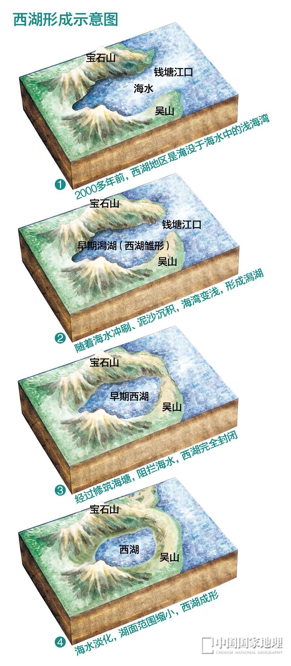 在几千年中,海平面下降,它就成了湿地;海平面升高,它又变成海湾。再之后,陆地渐渐形成,泻湖就彻底和海洋分隔开,大约2000年前,西湖最终完全形成。