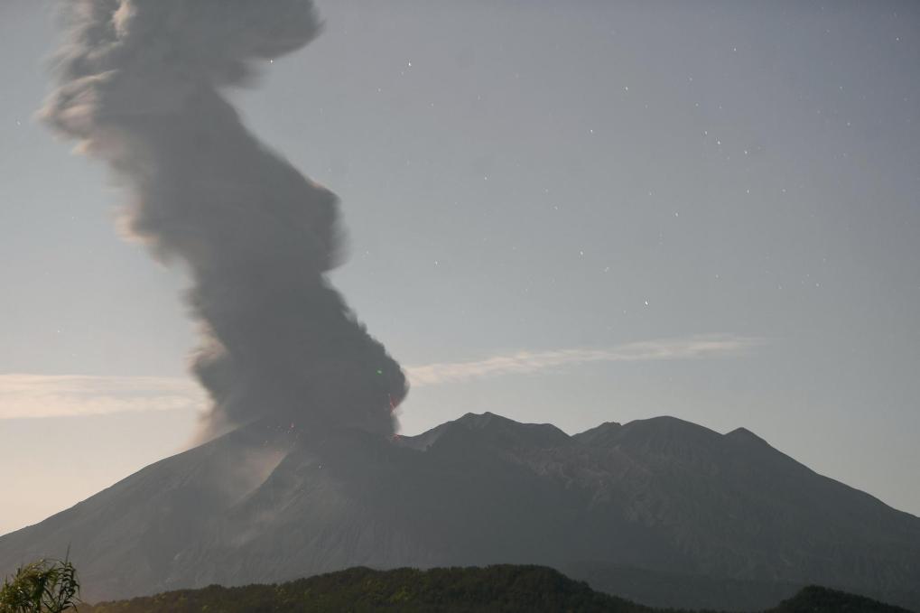 这是2021年4月25日在日本鹿儿岛县拍摄的喷发的樱岛火山(长时间曝光照片)。新华社/共同社