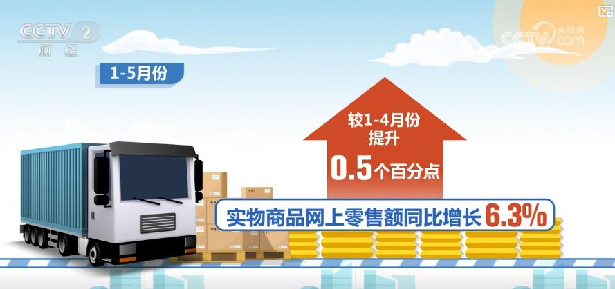 另外,消费物流需求加速释放。1—5月份,单位与居民物品物流总额同比增长6.4%,较1—4月份提高0.5个百分点。5月单位与居民物品物流总额同比增长8.3%,较4月提高2.1个百分点,显示在消费品以旧换新政策、假日经济带动下,单位与居民物品物流需求不断扩大。直播带货、即时零售等消费新业态日趋成熟。在电商促销及国补政策等因素叠加下,相关消费物流需求进一步激发。1—5月份,实物商品网上零售额同比增长6.3%,较1—4月份提升0.5个百分点。