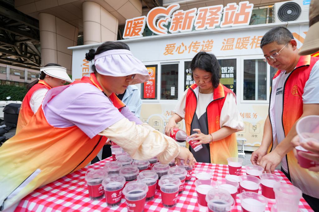 6月25日,在北京市东城区崇外街道一处“暖新驿站”外,街道工作人员在为高温下的外卖员、快递员准备冰镇饮料。新华社记者 鞠焕宗 摄