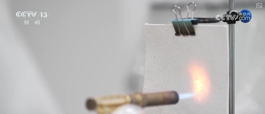 再升科技纤维研究院院长李志勇介绍,在飞机材料上有很多特殊的要求,比如要阻燃、防水、防潮,当然隔音和隔热是最基础的性能。这个火焰温度能达到1200摄氏度,它会红但是不会烧成一个洞或者烧破。