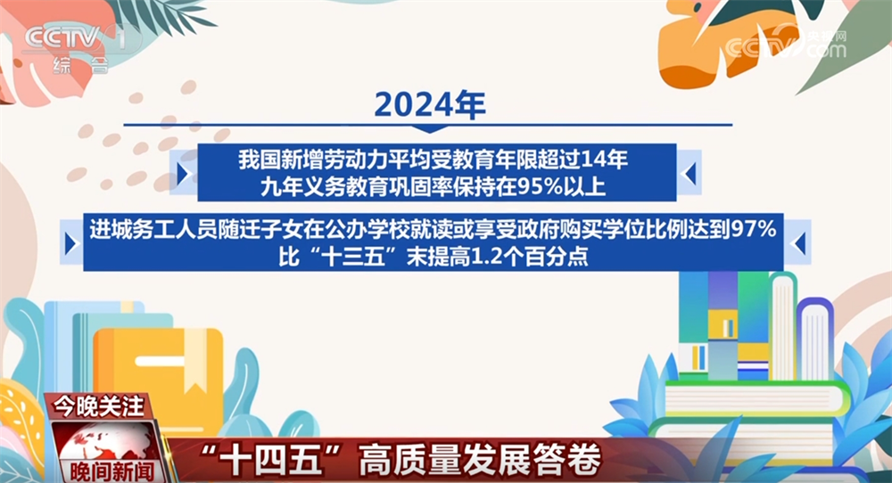 2024年,我国各级教育普及程度达到或超过中高收入国家平均水平,新增劳动力平均受教育年限超过14年,九年义务教育巩固率保持在95%以上。进城务工人员随迁子女在公办学校就读或享受政府购买学位比例达到97%,比“十三五”末提高1.2个百分点。