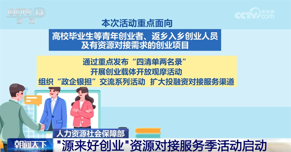 央视网消息:记者从人力资源社会保障部了解到,“源来好创业”资源对接服务季活动定于7月至9月在全国各地同步开展,通过搭建平台、拓展渠道、集聚资源促进高质量创业。