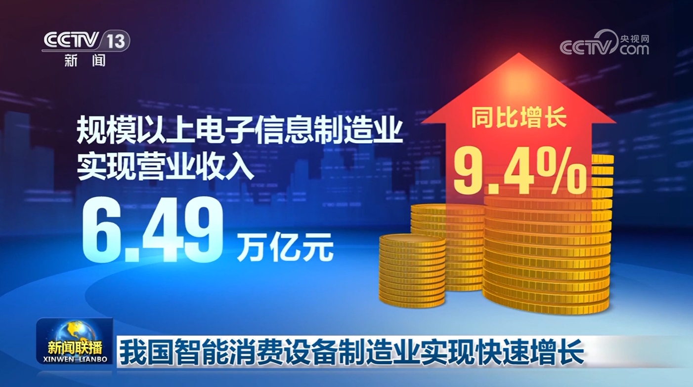 央视网消息(新闻联播):今年以来,在消费品以旧换新政策加力扩围和多元化消费场景创新拉动下,我国智能消费设备制造业实现快速增长。