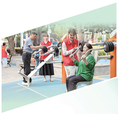 福建省福州市鼓楼区安泰街道五一广场的一处口袋公园,志愿者陪同老年人体验智慧健身器材。