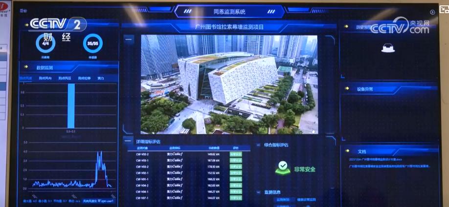 在图书馆中控室,幕墙拉索的实时拉力值汇集到一个幕墙安全监测系统,如果拉力值突破正常范围,系统就会自动报警,图书馆可以根据情况采取人员疏散等措施。