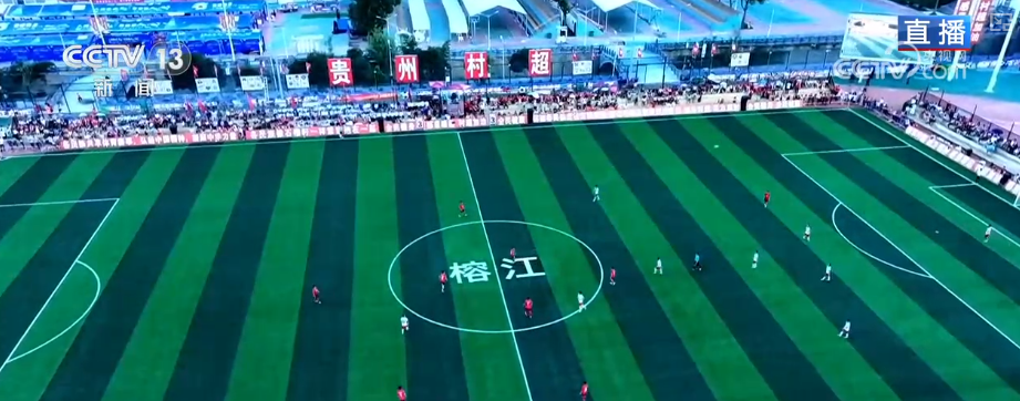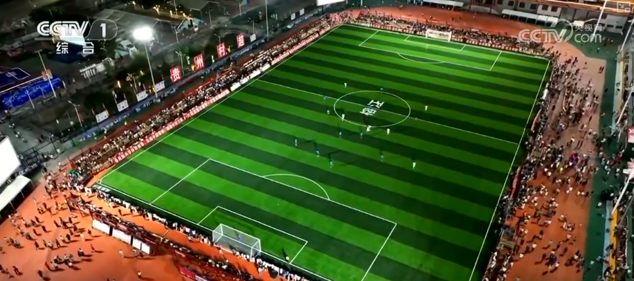 一个月前洪水来临的时候,整个“村超”球场的设施完全基本被摧毁了。这块人工草皮是榕江开始重建之后,只用了半个多月时间,从生产到运输再到铺设就全部完成。
